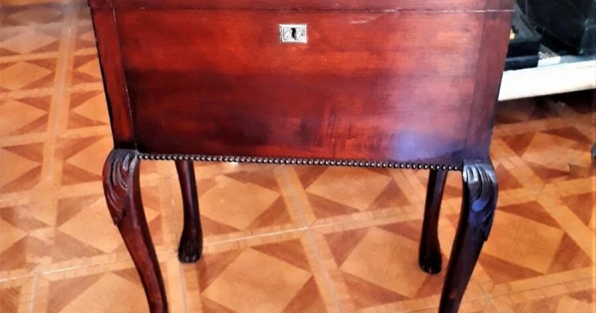 Elegante mueble costurero de estilo Reina Ana. Madera lustrada. interior con espejo y bolsillos para útiles. Tapa rebatible con soporte de bronce. Cerradura con su llave original. Dos asas de bronce laterales para transportarlo. Patas de estilo con pié claw and ball. Altura.76 cm. Largo 56 cm. Ancho 36 cm. Envios a cargo del comprador. Consulteme ante cualquier duda.