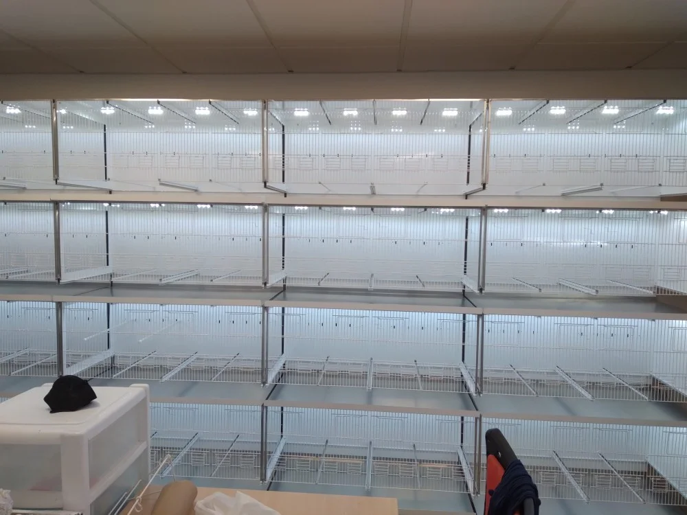 Batería de jaulas comunicables de 4 metros de largo 4 alturas. Total para 36 parejas, cada una con 50cm para criar. Muy amplio. Están prácticamente nuevas. Con programador y luces led. Hechas a medida por Ornialba. Muy buena calidad. Se venden con todos los accesorios (nidos, bizcocheras, bebederos, comederos, peleteras, medicineros…)